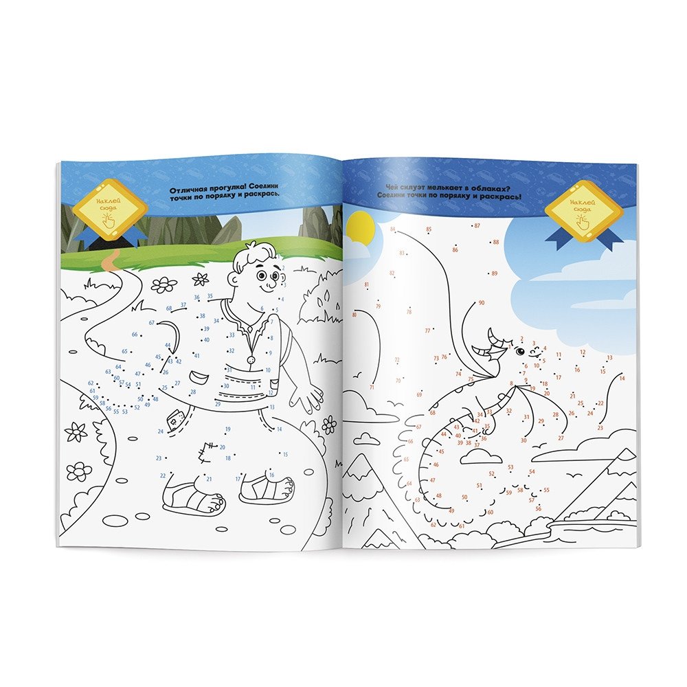 Раскраска с наклейками по точкам, буквам и цветам. Для мальчиков