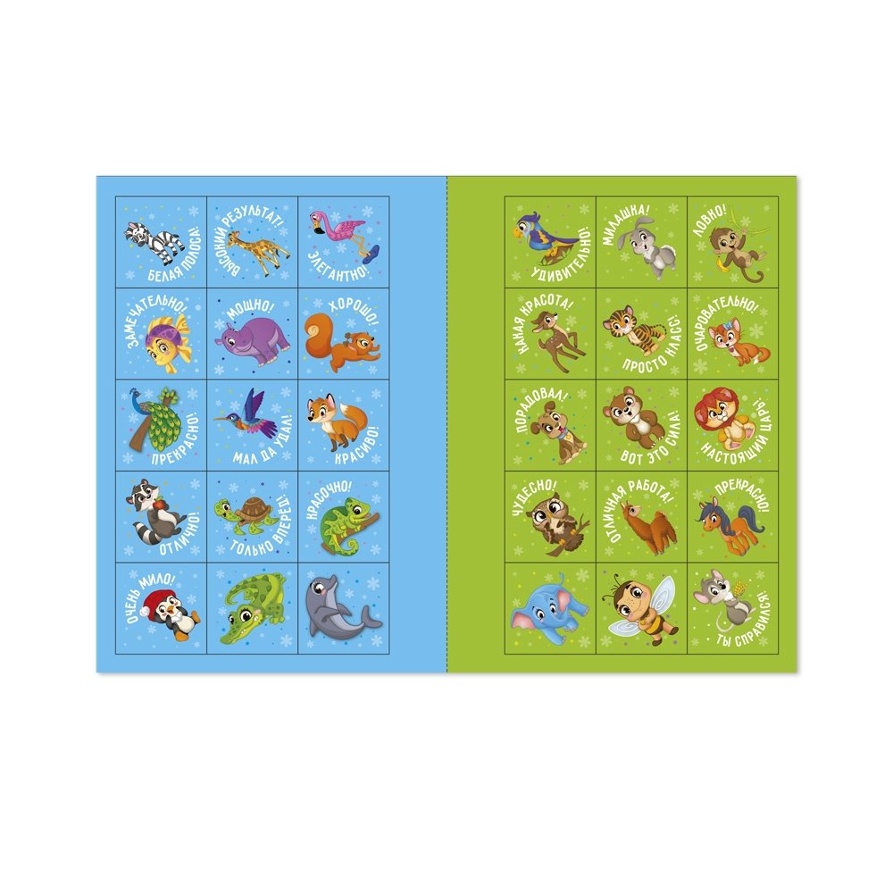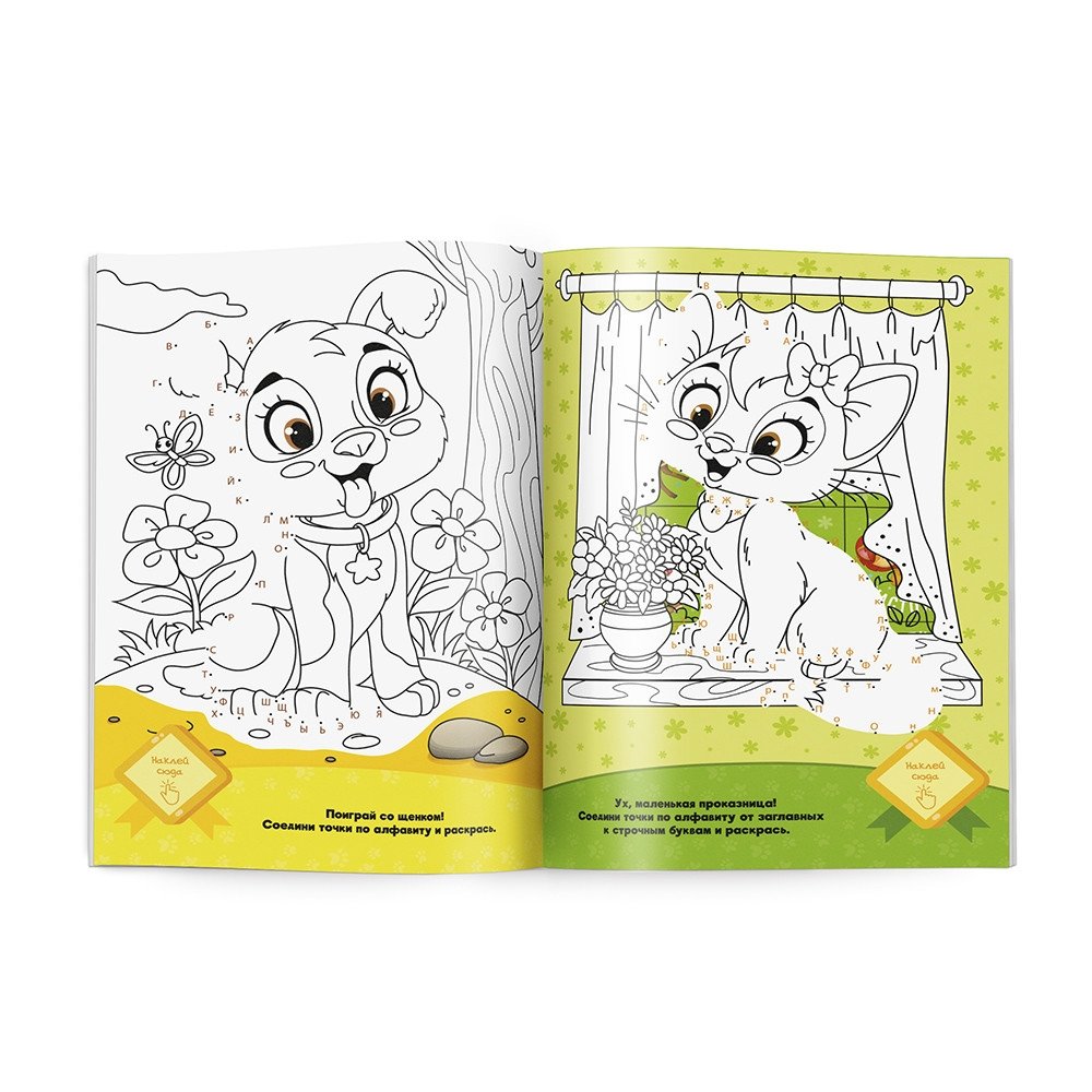 Раскраска с наклейками по точкам, буквам и цветам. Забавные животные