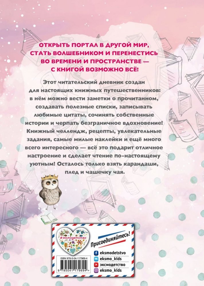 Этот дневник создан для тех, кто не представляет свою жизнь без книг. С его помощью можно ещё сильнее влюбиться в книги, начать читать больше и открыть удивительные миры, полные волшебства! Увлекательные задания, рецепты, книжный челлендж, таблички на дверь, самые милые наклейки и ещё много всего интересного – этот дневник подарит море вдохновения и уюта!