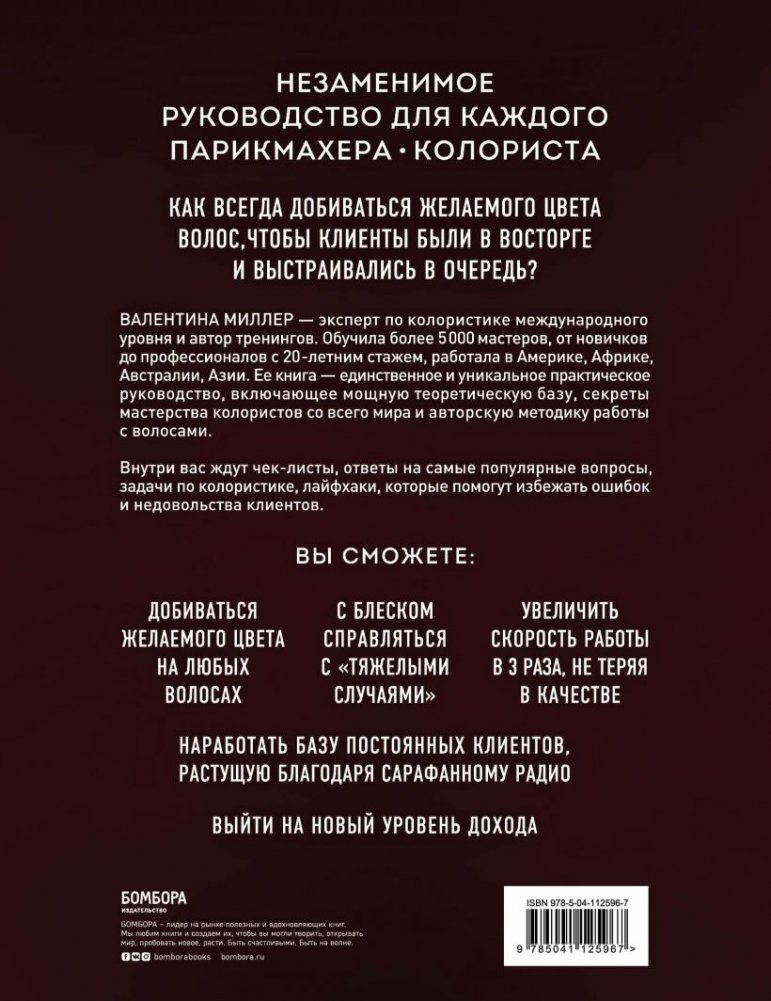 Валентина Миллер — эксперт по колористике с мировой известностью. Она подготовила более 5 000 профессионалов в этой сфере. Книга, которая сейчас перед вами, создана для всех парикмахеров-колористов любого уровня мастерства, которые хотят приобрести новые умения и навыки. С помощью этого практического руководства вы сможете глубоко проникнуть в теории колористики, узнать секреты замечательных мастеров со всего мира, познакомиться с авторскими лайфхаками, методами и тонкостями работы, а также наработать базу постоянных клиентов.