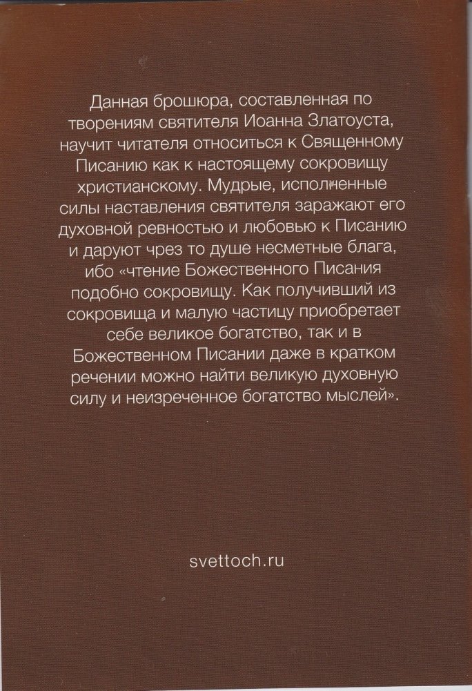 Данная брошюра, составленная по творениям святителя Иоанна Златоуста, научит читателя относиться к Священному Писанию как к настоящему сокровищу христианскому. Мудрые, исполненные силы наставления святителя заражают его духовной ревностью и любовью к Писанию и даруют чрез то душе несметные блага, ибо «чтение Божественного Писания подобно сокровищу. Как получивший из сокровища и малую частицу приобретает себе великое богатство, так и в Божественном Писании даже в кратком речении можно найти великую духовную силу и неизреченное богатство мыслей».