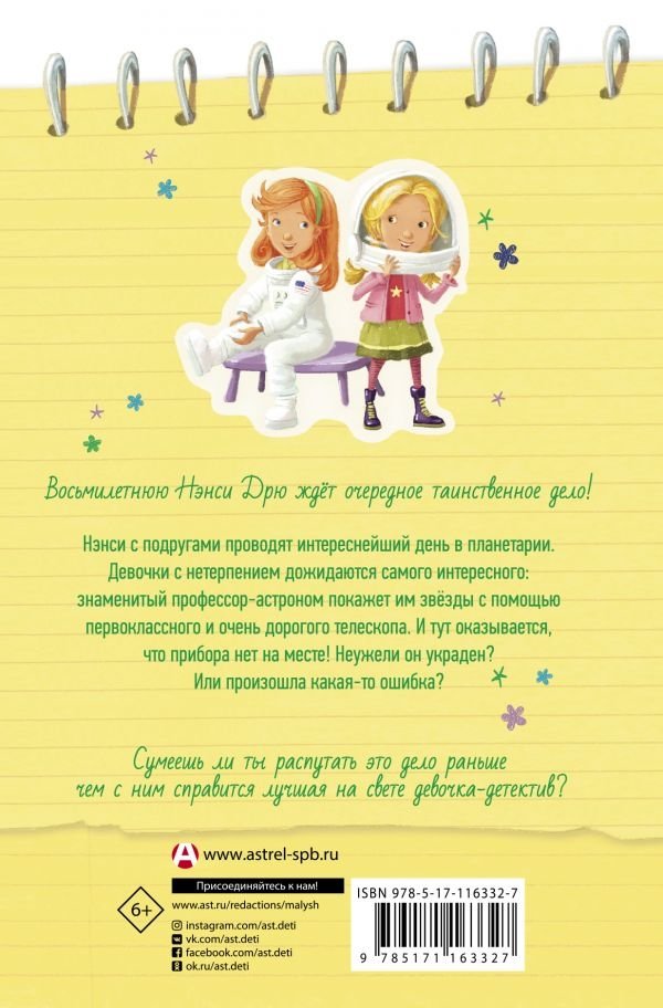 Нэнси с подругами проводят интереснейший день в планетарии. Девочки с нетерпением дожидаются самого интересного: знаменитый профессор-астроном покажет им звёзды с помощью первоклассного и очень дорогого телескопа. И тут оказывается, что прибора нет на месте! Неужели он украден? Или произошла какая-то ошибка?