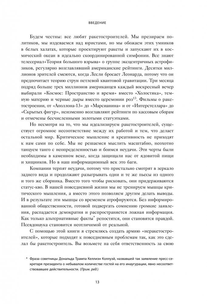 В своей дебютной книге бывший инженер NASA Озан Варол раскрывает девять простых стратегий, которыми пользуются астронавты и такие новаторы как Илон Маск. Используйте и вы их в своей жизни: будь то посадка на рабочее место вашей мечты, ускорение вашего бизнеса, изучение нового навыка или создание следующего прорывного продукта. Все мы сталкиваемся в своей жизни со сложными и незнакомыми проблемами. Те, кто может справиться с возникающими задачами — самостоятельно, без стресса и точно в срок — пользуются огромным преимуществом и добиваются огромных успехов. Дерзайте!