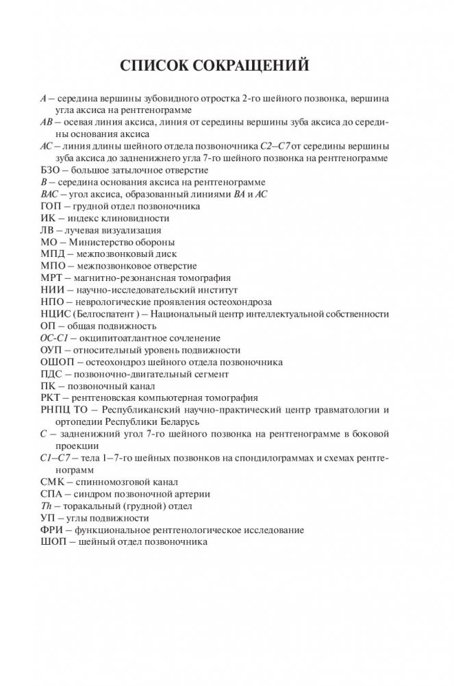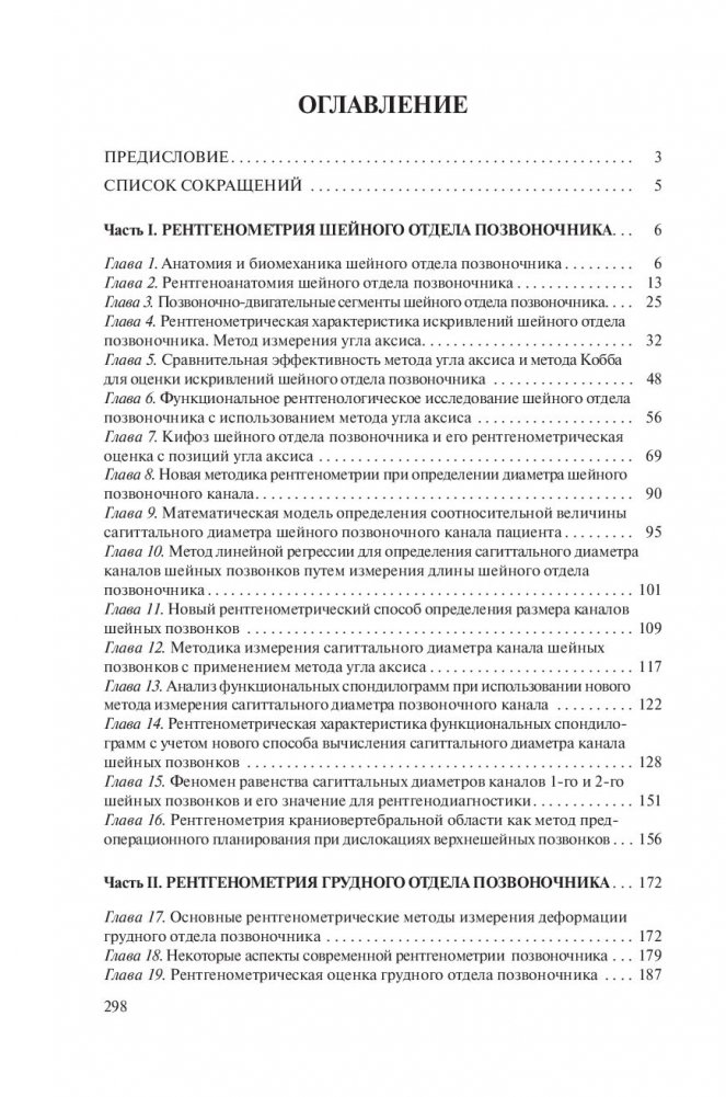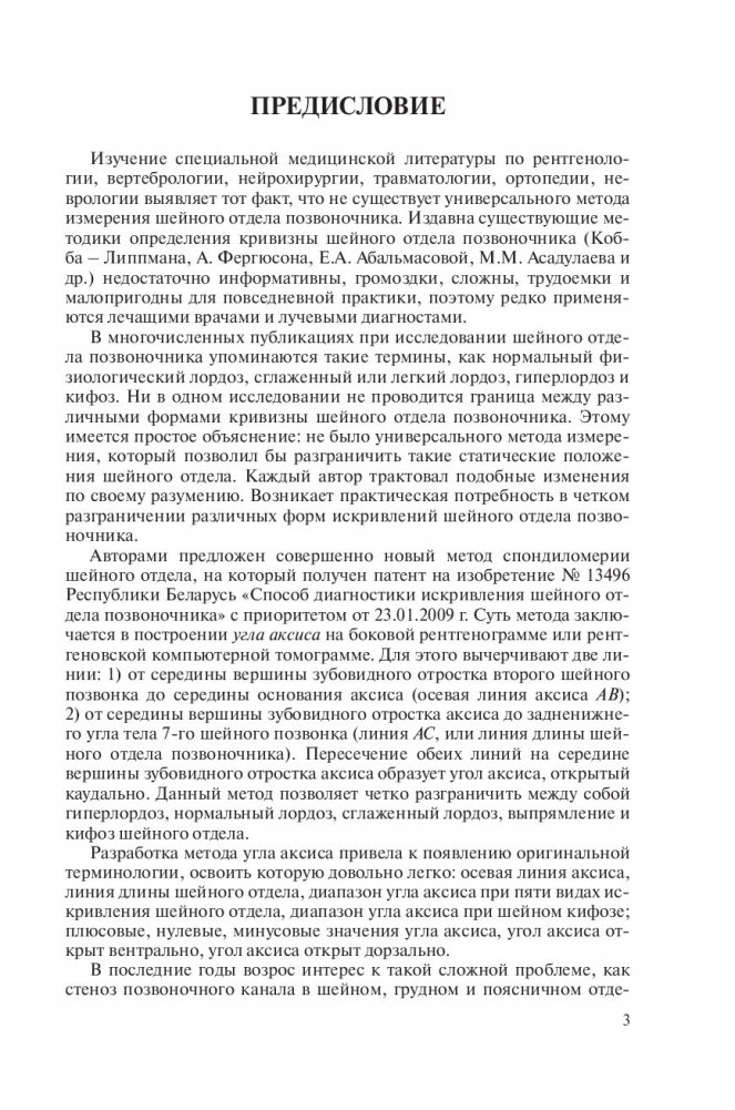 Изложен новый рентгенометрический способ оценки искривлений шейного отдела позвоночника – метод измерения угла аксиса. Описаны оригинальные методики измерения сагиттального диаметра канала шейных и поясничных позвонков, с новых позиций охарактеризован кифоз шейного отдела. Доказана важность рентгенометрических измерений при операциях на позвоночнике.