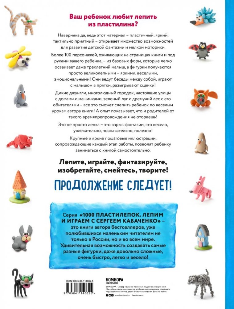 Уникальный авторский метод Сергея Кабаченко, автора бестселлеров, уже полюбившихся маленьким читателям не только в России, но и во всем мире, - это удивительная возможность создавать самые разные фигурки, даже довольно сложные, очень быстро, легко и весело! Все персонажи этой книги рождаются из базовых форм, которые легко осваивает даже трехлетний малыш, а фигурки получаются просто великолепными – яркими, веселыми, эмоциональными! Они ведут беседы между собой, играют с малышом в прятки, разыгрывают сценки! Крупные и яркие пошаговые иллюстрации, сопровождающие каждый шаг работы, позволят ребенку заниматься с книгой самостоятельно, но и родители, желающие помочь малышу в творчестве, получат море удовольствия от работы с книгой. Более 100 персонажей, оживающих на страницах книги и под руками вашего малыша! Лепите, играйте, фантазируйте, изобретайте, смейтесь, творите! Продолжение следует!