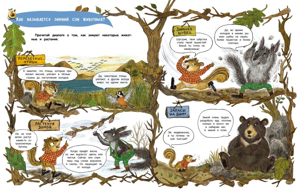 В состав комплекта входят: 1. "Кто украл орехи?". Эта книга расскажет тебе о том, как зимуют животные в лесу. Ты узнаешь, кто умеет находить еду под толстым слоем снега, чьё тело во время зимней спячки остывает до минусовых температур, почему белочка зимой меняет шубку и много других интересных фактов. А ещё ты сможешь принять участие в самом настоящем детективном расследовании. Посреди зимы кто-то украл орехи из норки бурундучка Хрума — нужно непременно их найти.