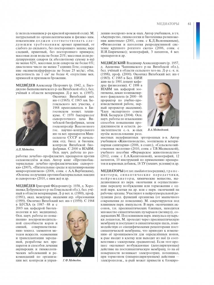 «Ветеринарная энциклопедия» — новое научно-справочное издание, в котором содержатся практически все сведения по анатомии, физиологии, профилактике и лечению болезней, кормлению и содержанию сельскохозяйственных животных. Книга не имеет аналогов на территории СНГ. В создании энциклопедии принимали участие ученые-специалисты Витебской государственной академии ветеринарной медицины, Института экспериментальной ветеринарии имени С.Н. Вышелесского и Белорусского государственного ветеринарного центра. Большая часть статей первого тома энциклопедии посвящена болезням животных, их распространению, распознаванию, методам лечения и профилактики. Ряд статей посвящен ветеринарно-санитарной экспертизе продуктов животноводства, радиологии, зоогигиене, организации ветеринарного дела в государственных и фермерских хозяйствах. Надлежащее внимание уделено способам доврачебной помощи больным животным, использования лекарственных растений для их лечения и осветления смежных с животноводством и ветеринарией вопросов общей биологии, зоологии, биохимии и биофизики. Энциклопедия предназначена для ветеринаров, зоотехников, фермеров, преподавателей, студентов средних и высших учебных заведений, специальных ветеринарных учреждений и широкого круга читателей.
