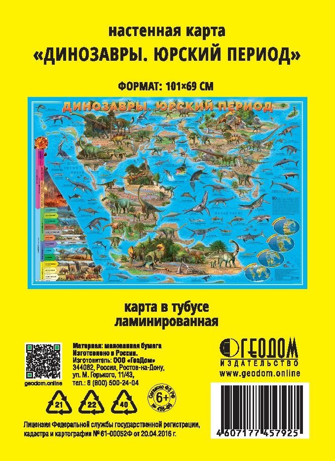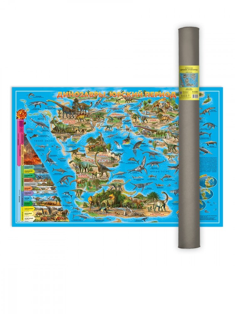 Задумывались ли вы о том, как располагались материки на нашей планете в древние времена? Какие обитатели населяли их? Карта «Динозавры. Юрский период» наглядно иллюстрирует положение материков и представляет обитателей Земли во времена Юрского периода. Огромные и устрашающие динозавры, птерозавры, ихтиозавры, плиозавры – царили на Земле. Кроме того, на карте представлена схема континентального дрейфа и временная шкала истории Земли.