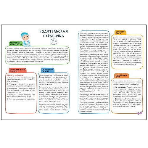 Книга «Развитие речи 0+» из серии «Школа Семи Гномов. Активити с наклейками» предназначена для развития речи и формирования словарного запаса у детей от рождения до года.