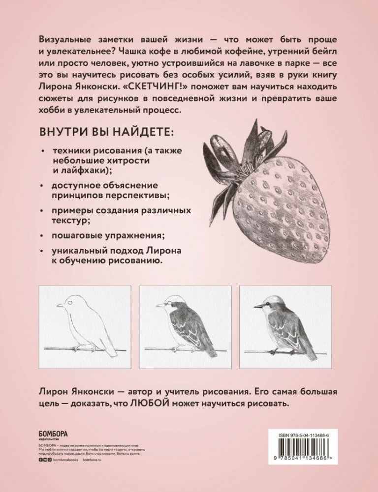 Скетчинг — это техника быстрых зарисовок, набирающая популярность с каждым днем. Визуальные заметки вашей жизни — что может быть проще и одновременно увлекательнее? Чашка кофе в любимой кофейне, утренний бейгл с запахом пекарни, или просто человек, уютно устроившийся на лавочке в парке — все это вы научитесь рисовать без особых усилий, взяв в руки книгу Лирона Янковски. В этой исчерпывающей книге по скетчингу вы найдете пошаговые инструкции, которые проведут вас от самой первой линии, и до тех пор, пока вы не научитесь наблюдать за объектами самостоятельно.