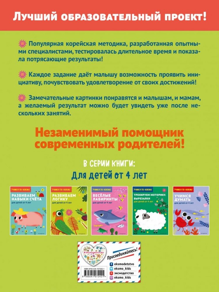 Основная задача пособия — развить логическое мышление дошкольника в процессе игры. Задания разработаны опытными специалистами на основе известнейшей в мире корейской методики, которая тестировалась длительное время и показала потрясающие результаты. Разнообразные упражнения, чётко ориентированные на возраст ребёнка, вызывают у него желание заниматься и формируют позитивный настрой. Каждое задание даёт малышу возможность проявить инициативу и почувствовать удовлетворение от своих достижений. Выполняя разнообразные занимательные задания, ребёнок приготовит вкусное блюдо из различных ингредиентов; отгадает нового жильца дома, используя имеющуюся информацию; попробует заполнить логические квадраты; пройдёт лабиринт по буквенному коду и выполнит логические задания с буквами и цифрами; будет находить лишние предметы в группе и т.д. Замечательные добрые картинки повысят интерес ребёнка к занятиям, а доступность заданий придаст уверенности в себе. Адресована современным родителям, которые хотят видеть своих детей развитыми, способными решать поставленные перед ними задачи, успешными в жизни.