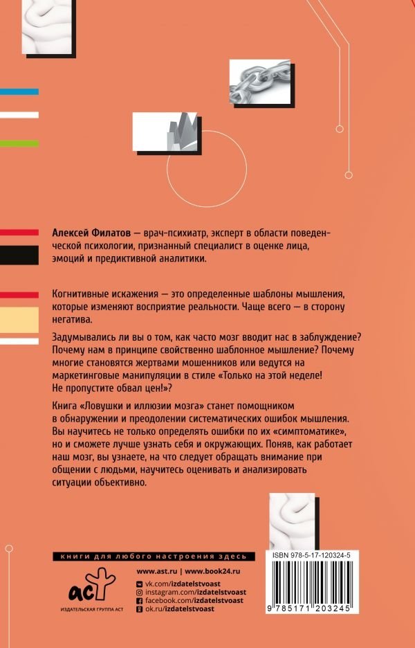 В книге "Ловушки и иллюзии мозга" представлены типичные ошибки мышления, так называемые когнитивные искажения. Научившись их определять и прорабатывать, вы сможете лучше понять себя и окружающих, а также выстраивать коммуникацию правильно. Когнитивные искажения — это определенные шаблоны мышления, которые изменяют восприятие реальности. Чаще всего — в сторону негатива.