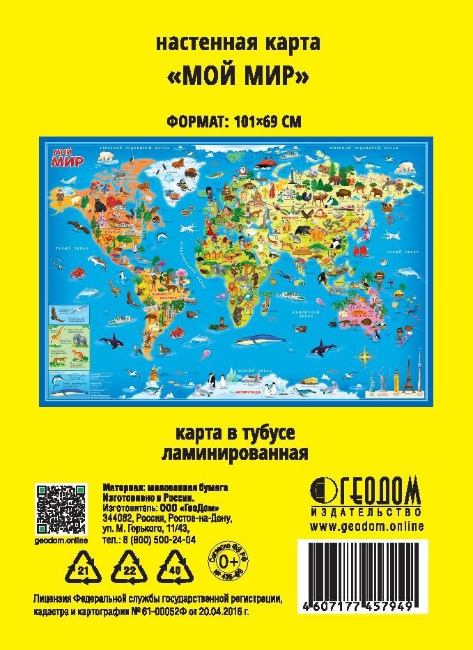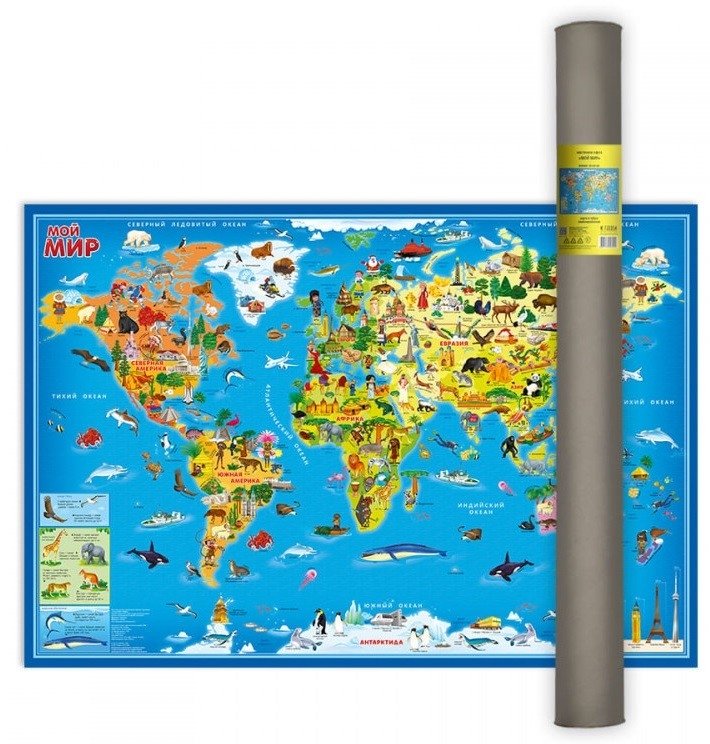 С большой настенной картой "Мой мир" от издательства "ГЕОДОМ" ребенок познакомится с миром вокруг, расширит кругозор. На карте изображены материки и океаны, животные и растения, а также достопримечательности со всех уголков нашей планеты. Формат карты очень удобный, позволяет рассмотреть все детали. Карта станет замечательным украшением детской комнаты.