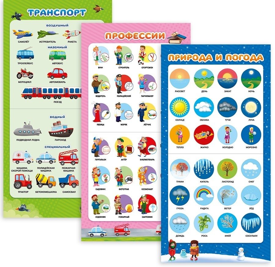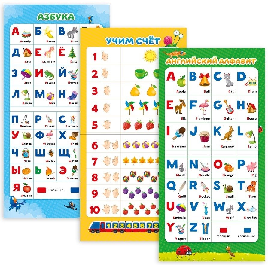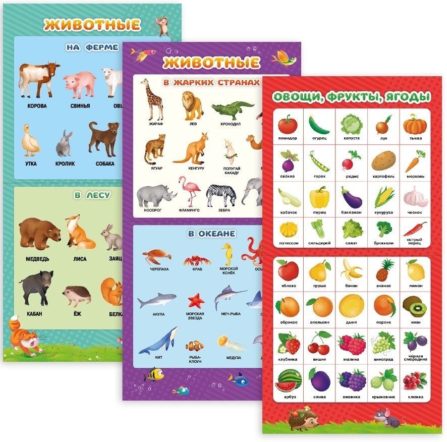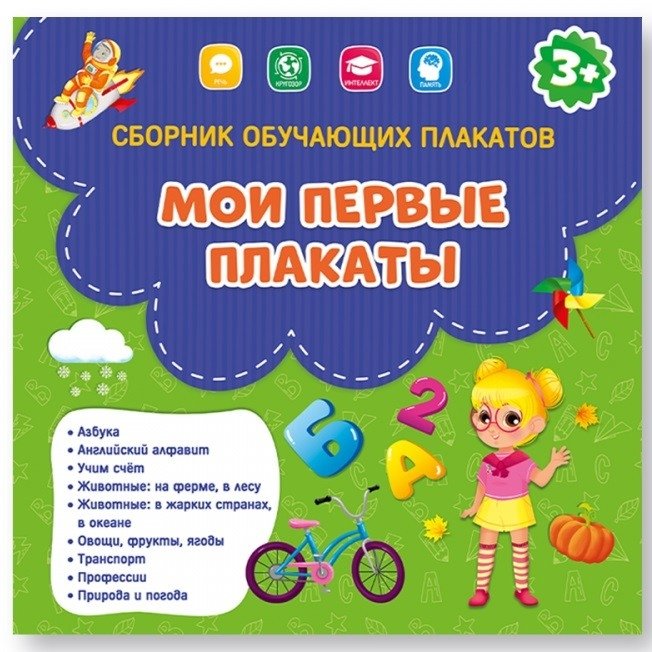 Сборник состоит из 9 обучающих плакатов, с помощью которых ребенок познакомится с буквами русского и английского алфавита, цифрами, животными, фруктами, овощами и ягодами, транспортом, профессиями и природными явлениями.