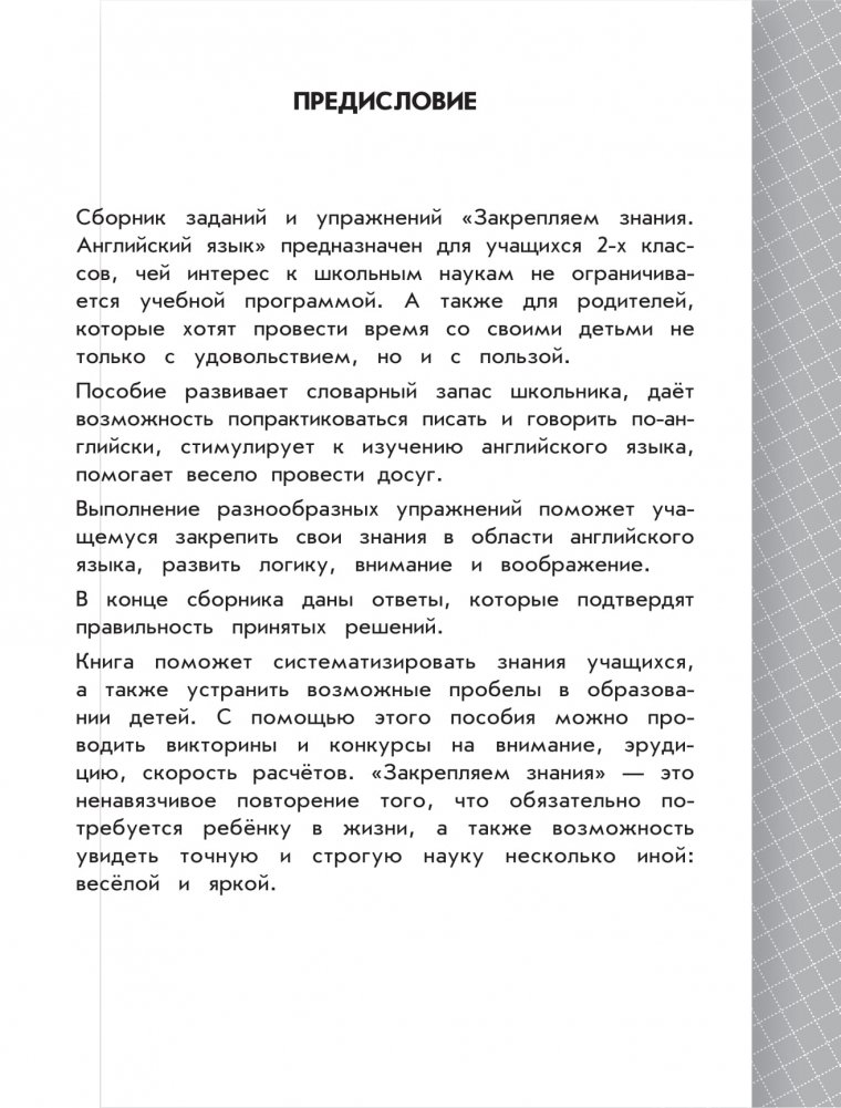 Пособие, соответствующее ФГОС, поможет учащимся 2 класса в занимательной форме закрепить знания по грамматике английского языка, расширить словарный запас, потренировать логику и внимание, а также повысить уровень IQ, улучшить успеваемость по предмету, интересно и с пользой провести время. Сборник может быть использован в качестве дополнительного материала в школе, для индивидуальной работы дома, для повторения знаний во время каникул.