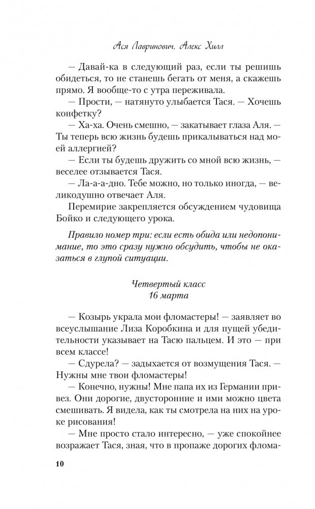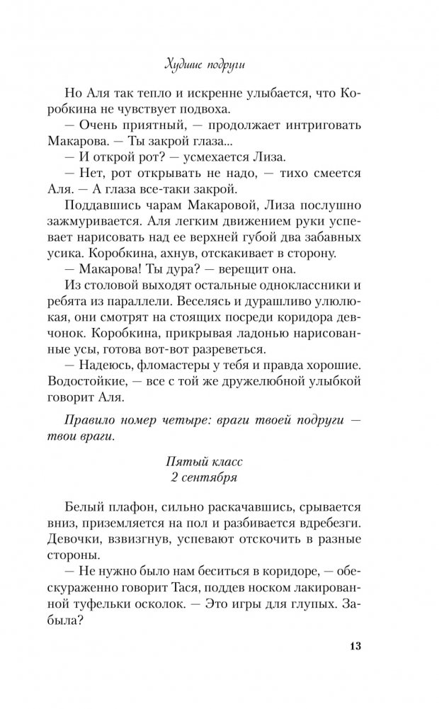 Аля Макарова и Тася Козырь дружат с первого класса. Две яркие девчонки без проблем делят между собой школьную корону и с гордостью носят ее вместе, крепко держась за руки. А список правил, составленный за годы их дружбы, хранит и оберегает девчонок от ссор и неудач. Последний год в школе обещает быть незабываемым, но отчего-то все идет наперекосяк. Правила нарушены. Друзья ведут себя странно, поклонники переключаются на других. А начинается это все с того, что в школе появляется новенький…