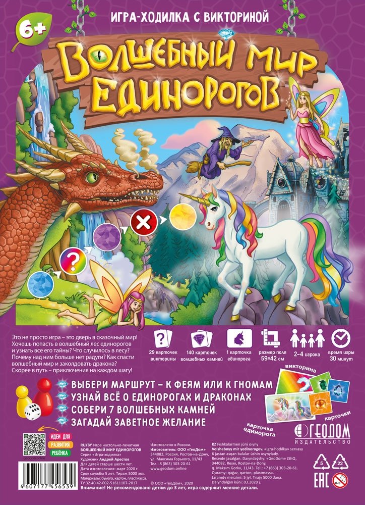 Комплектация: Игровое поле, кубик, 4 фишки, карточки с вопросами, карточки камни, карточка с радужным единорогом, правила игры.