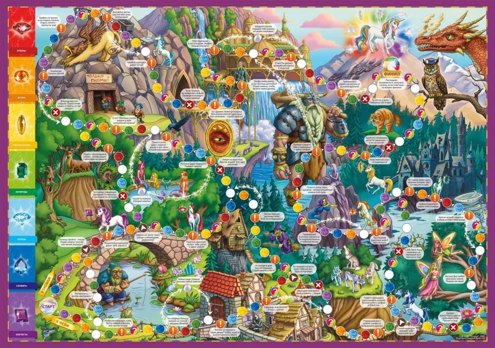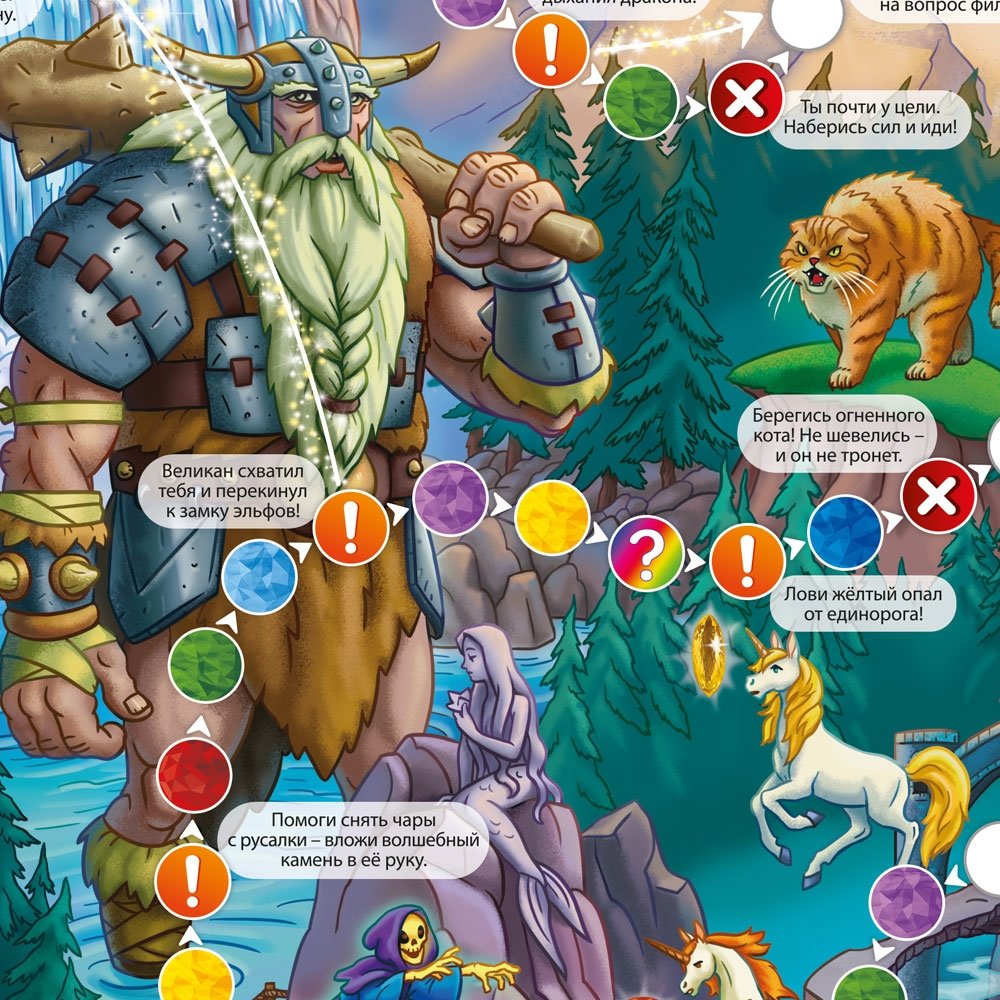 «Волшебный мир единорогов» не просто настольная игра-ходилка - это дверь в сказочный мир! Теперь ребенок может легко попасть в страну единорогов и изучить все ее тайны. Что случилось в заколдованном лесу? Почему над ним больше нет радуги? Как спасти волшебный мир и заколдовать дракона? Игра интригует на каждом ходу. Яркие и интересные иллюстрации поля можно рассматривать часами. Плюс в дополнение, викторина и задания. Все это в одной игре.