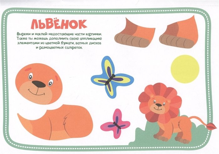 "Первые аппликации"- эта серия развивающих брошюр познакомит вашего малыша с лесными жителями, домашними животными, питомцами и обитателями подводного мира. Помимо деталей животных, вы сможете дополнить свою аппликацию цветной бумагой, которая идёт в комплекте, а также салфетками, пайетками, ватными дисками и другими декоративными элементами, которые есть у вас дома.
