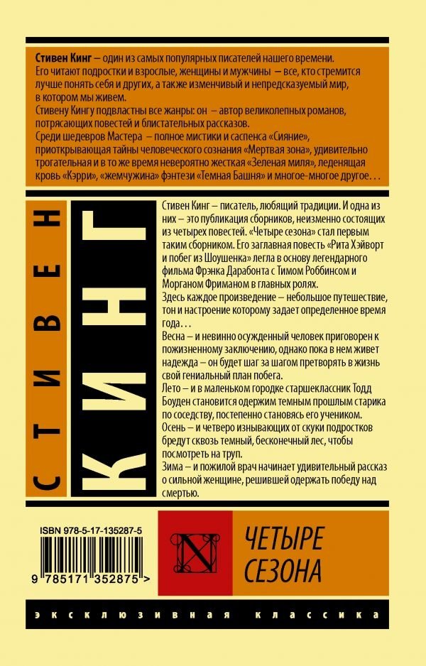 Стивен Кинг — писатель, любящий традиции. И одна из них — это публикация сборников, неизменно состоящих из четырех повестей. «Четыре сезона» стал первым таким сборником. Его заглавная повесть «Рита Хэйворт и побег из Шоушенка» легла в основу легендарного фильма Фрэнка Дарабонта с Тимом Роббинсом и Морганом Фриманом в главных ролях.