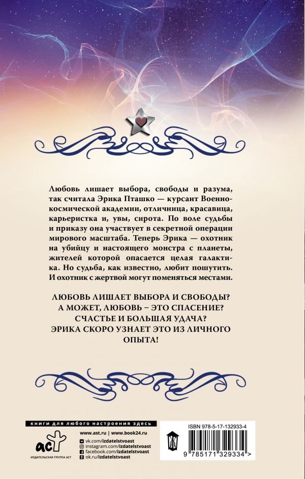 Любовь лишает выбора, свободы и разума, так считала Эрика Пташко — курсант Военно-космической академии, отличница, красавица, карьеристка и, увы, сирота. По воле судьбы и приказу она участвует в секретной операции мирового масштаба. Теперь Эрика — охотник на убийцу и настоящего монстра с планеты, жителей которой опасается целая галактика. Но судьба, как известно, любит пошутить. И охотник с жертвой могут поменяться местами.