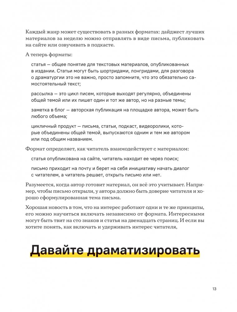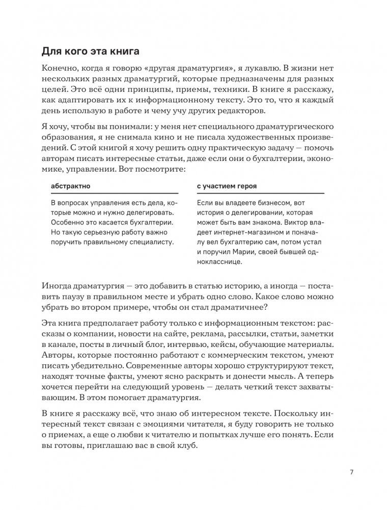 От автора бестселлера "Пиши, сокращай" и "Правила деловой переписки" Копирайтеры, редакторы, журналисты знают, что их работа не такая уж творческая, как кажется со стороны. Чаще нужно написать текст быстро, хорошо его структурировать и разобрать скучную тему, вроде бухгалтерии и законов. Но даже в этом случае есть способ сделать текст интересным: в этом помогают приемы драматургии. Книга "Уступите место драме" рассказывает, как захватить внимание читателя на разных уровнях: темой, подачей, заголовком, акцентами, композицией, конфликтом. Это всё доступно в коммерческом тексте и даже если у автора мало времени на работу. Людмила Сарычева обещает: чтобы работать с драматургией, не обязательно быть сценаристом и писателем. Можно уступить немного места драме даже там, где сначала ее не было.