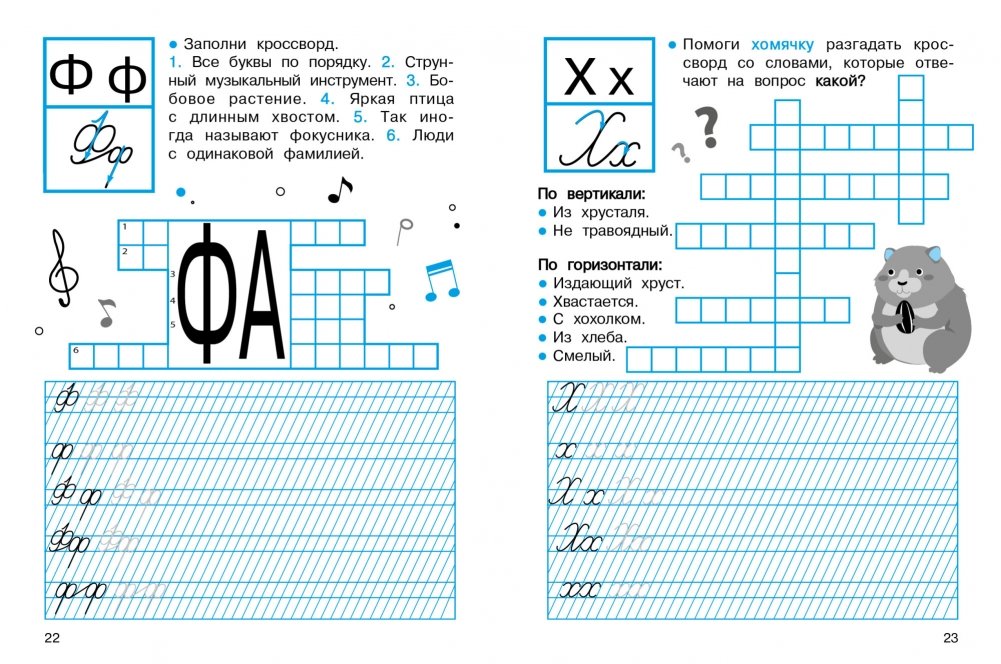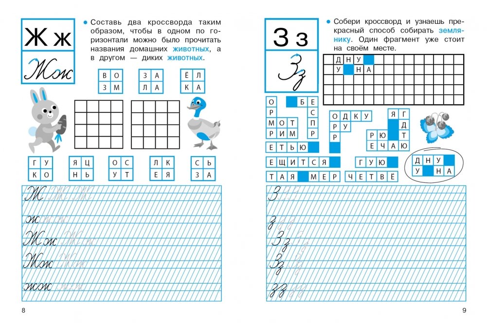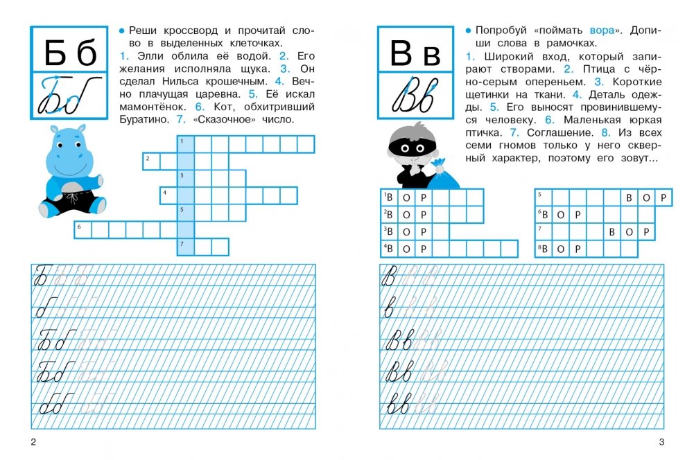 Пособие поможет первоклассникам освоить правильное написание и соединение букв, а различные кроссворды, чайнворды и «лесенки» слов активизируют у ребёнка умственную деятельность, развивают логическое мышление и память, помогают обогатить словарный запас, формируют орфографическую зоркость.