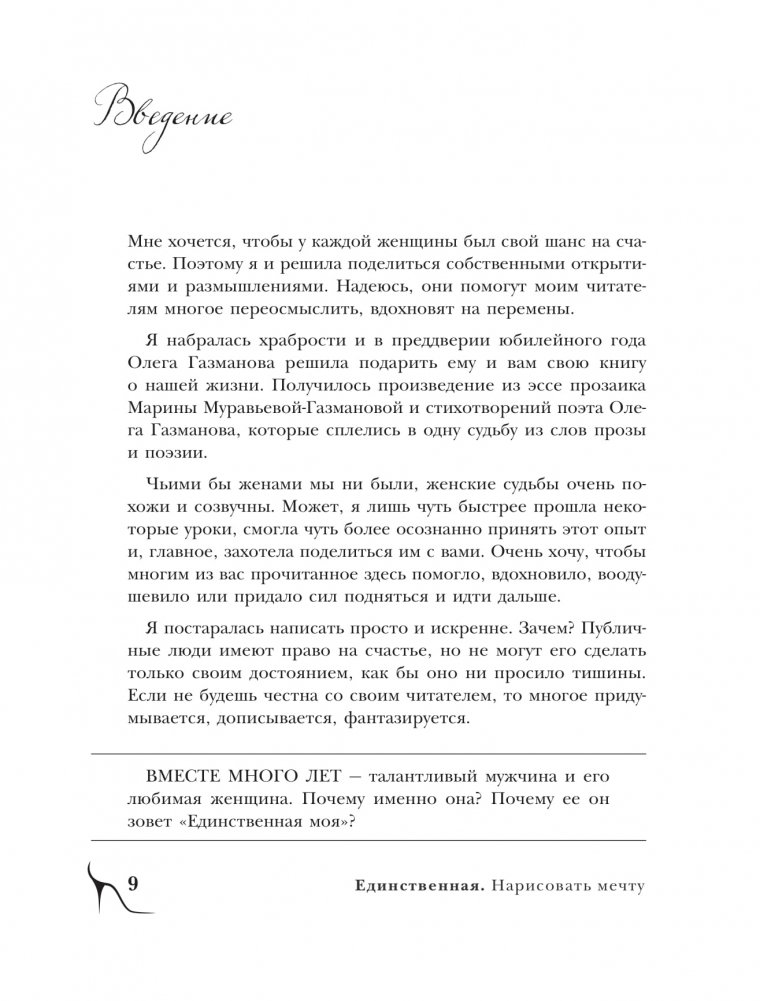 Книга колумниста, психолога Марины Муравьевой-Газмановой, музы певца, поэта и композитора Олега Газманова — это не только рассказ об одной из самых романтичных любовных историй современности. Автор ставит перед читателем порой совсем непростые вопросы о женственности, красоте, саморазвитии, женской дружбе, воспитании детей и раскрывает тайну истинной неотразимости. "Я набралась храбрости и в преддверии юбилейного года Олега Газманова решила подарить ему и вам свою книгу о нашей жизни. Получилось произведение из эссе прозаика Марины Муравьевой-Газмановой и стихотворений поэта Олега Газманова"