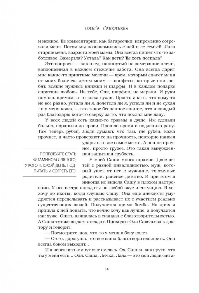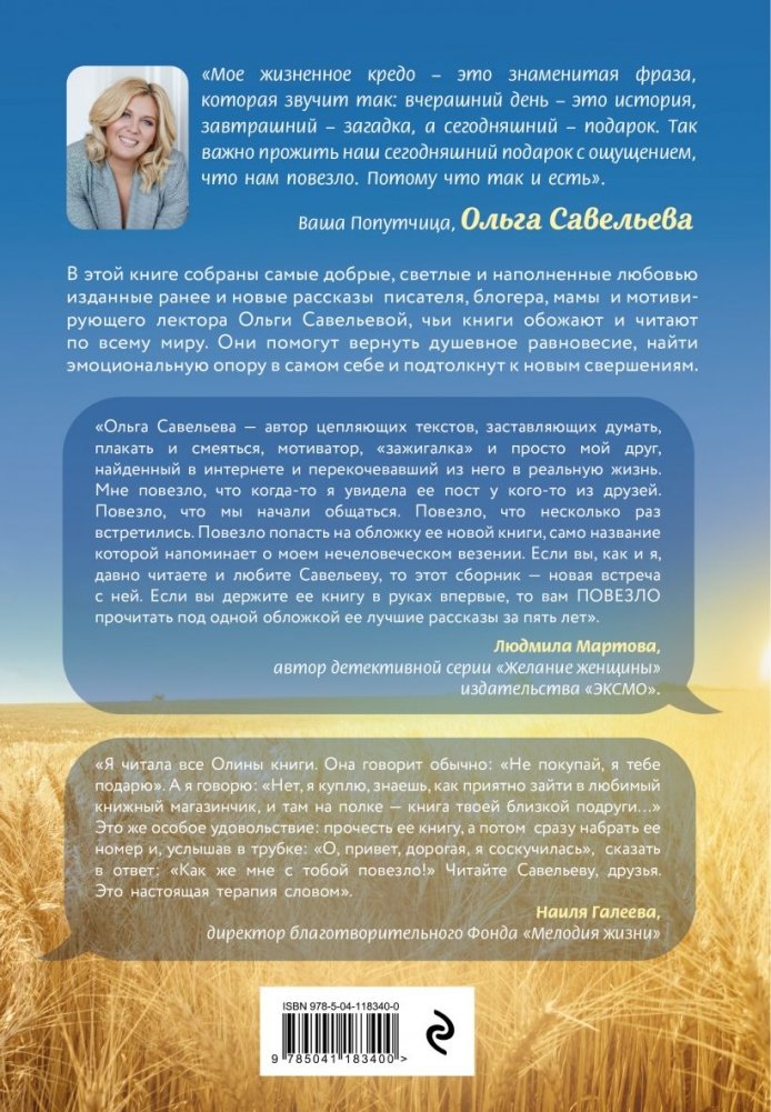 Помните, как в детстве мы подкладывали монетку под пятку перед экзаменом, а после получения заветной "пятерки" счастливо выдыхали: "Повезло!". Этот сборник – ваш счастливый пятак. Только не для экзамена по математике, а для другого, более важного, который мы сдаем всю свою жизнь. Экзамена под названием "счастье". Ольга Савельева – мотивирующий лектор, блогер и автор бестселлеров, заботливо собрала в него самые лучшие и вкусные свои рассказы из изданных и несколько новых. Они согреют изнутри, помирят тех, кто в ссоре, помогут найти силы и вдохновение в минуты слабости и научат встречать каждый новый день с улыбкой.