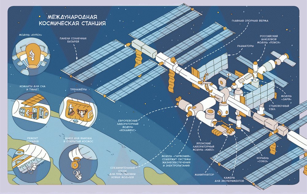 Высокий уровень детализации в иллюстрациях. Читатели смогут рассмотреть устройство Международной космической станции и космодрома Байконур.