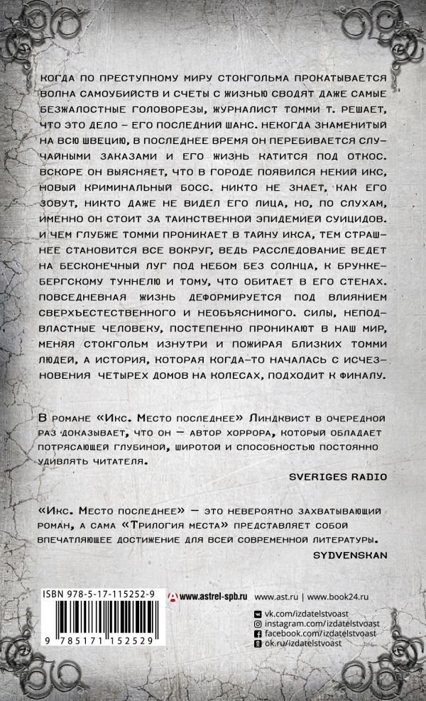 Когда по преступному миру Стокгольма прокатывается волна самоубийств и счеты с жизнью сводят даже самые безжалостные головорезы, журналист Томми Т. решает, что это дело — его последний шанс. Некогда знаменитый на всю Швецию, в последнее время он перебивается случайными заказами и его жизнь катится под откос. Вскоре он выясняет, что в городе появился некий Икс, новый криминальный босс. Никто не знает, как его зовут, никто даже не видел его лица, но, по слухам, именно он стоит за таинственной эпидемией суицидов. И чем глубже Томми проникает в тайну Икса, тем страшнее становится все вокруг, ведь расследование ведет на бесконечный луг под небом без солнца, к Брункебергскому туннелю и тому, что обитает в его стенах. Повседневная жизнь деформируется под влиянием сверхъестественного и необъяснимого. Силы, неподвластные человеку, постепенно проникают в наш мир, меняя Стокгольм изнутри и пожирая близких Томми людей, а история, которая когда-то началась с исчезновения четырех домов на колесах, подходит к финалу.