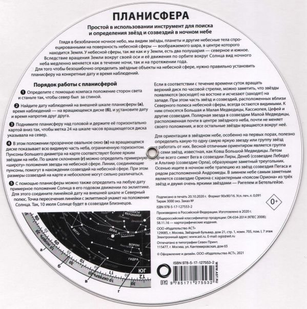 Планисфера - простой и удобный инструмент для наблюдения за звёздным небом. С её помощью можно на любую дату и время суток определить, какие именно звёзды и созвездия видны в небе, а также установить примерное положение Солнца в его годовом движении по эклиптике. На карте планисферы показаны звёзды вплоть до 5-й видимой звёздной величины в диапазоне склонения от +90 до -50 град. Чтобы увидеть участок ночного звёздного неба, видимый в вашей местности, достаточно сориентироваться по сторонам света и, вращая подвижный диск, установить требуемые дату и время наблюдений. Планисфера пригодна в качестве средства обучения для любого возраста, начиная с младшего школьного. Планисфера упакована в пакет из прозрачного пластика с еврослотом.