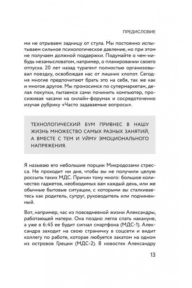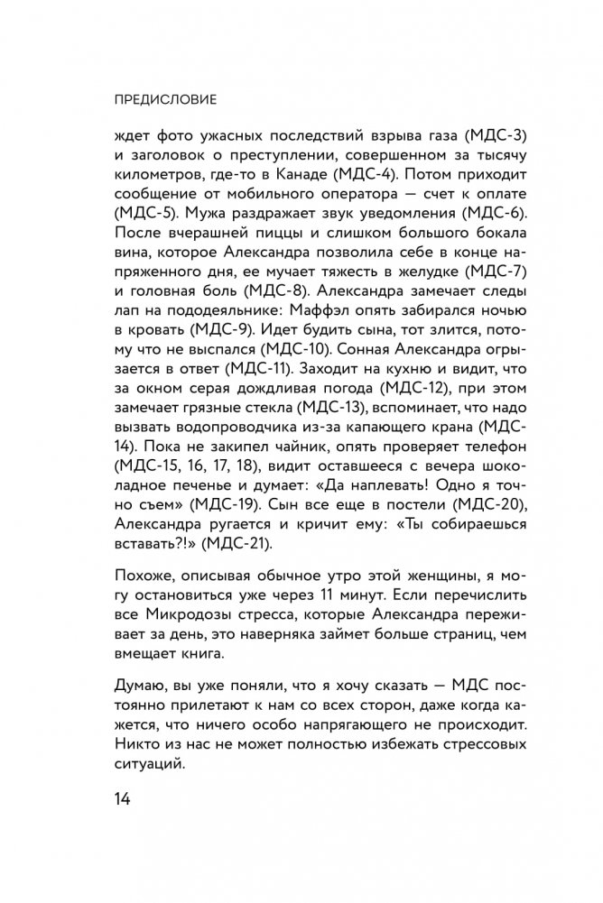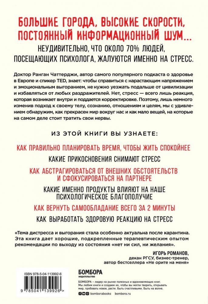 Вечная спешка, сорванные дедлайны, споры с партнером, лишний вес… как тут оставаться спокойным? Вы думаете, что решите одну проблему и все наладится, но на ее место тут же приходит новая, а то и две. Стресс опасен тем, что сам по себе обладает силой порождать еще больший стресс. Чем больше его накапливается, тем хуже мы справляемся с ним и тем ближе подходим к черте, за которой невозможно успешно управлять своей жизнью. Неудивительно, что ВОЗ объявила стресс "Эпидемией XXI века". Но доктор Ранган Чаттерджи, автор самого популярного подкаста о здоровья в Европе и спикер TED, полон решимости это изменить. В своей книге он раскрывает секрет, как справляться с нарастающим напряжением и вернуть душевное равновесие. Не все знают, но на умение правильно реагировать на сложные ситуации влияет не только врожденная стрессоустойчивость, но и вполне конкретные продукты, действия, мысли и упражнения. Так, например, яблоки снижают риск депрессии, а форель или палтус могут быстро повысить настроение. Занятие на скалодроме очистит ваши мысли, а вот длительная пробежка, наоборот, привести иммунную систему в состояние тревоги. После прочтения этой книги в ваших руках окажется целый набор полезных инструментов, с помощью которых вы создадите вокруг себя защитное силовое поле спокойствие. С ним вы станете практически не уязвимым.