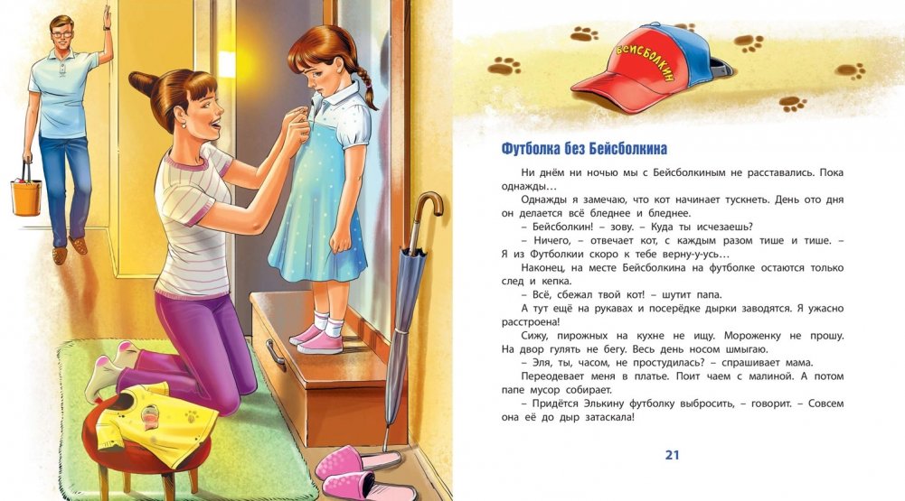 Была у девочки Эли футболка. Да не простая, а особенная. А всё потому, что жил на этой футболке... кот в бейсболке! И звали того кота – Бейсболкин. Замечательный был кот! Он и мысли читать умел, и на самокате был рад прокатиться. Даже колыбельные Эле напевал. Всё они с Элей делали вместе. Не верите? Тогда открывайте скорее эту удивительную книгу и убедитесь сами!