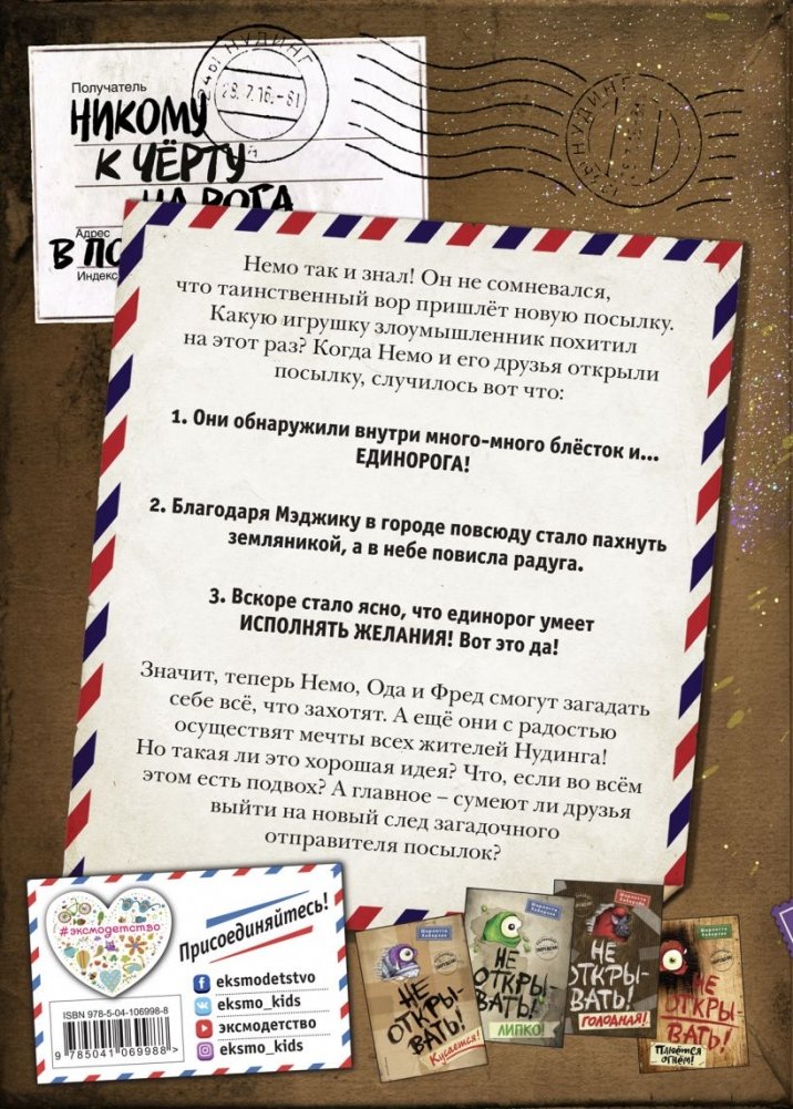 Новая посылка уже здесь! Немо, Ода и Фред так и знали, что таинственный вор объявится снова! На этот раз он прислал посылку, усыпанную блёстками. Когда друзья открыли её, они обнаружили внутри живого ЕДИНОРОГА! У Мэджика разноцветная чёлка, из-за него в городе повсюду стало пахнуть земляникой, а ещё он легко исполняет желания! Ребята не могут поверить своему счастью: неужели им наконец повезло и ожившая игрушка не доставит им никаких неприятностей?! Теперь они смогут пожелать себе что угодно! Но что, если во всём этом есть подвох? Может быть, Мэджик не так прост, как кажется? И получится ли у Немо и его друзей выйти на новый след отправителя посылок? "Здесь есть всё, что нужно хорошей детской книге: дружба, веселье, приключения и даже первая влюбленность", журнал о книгах Buchmedia Magazin.