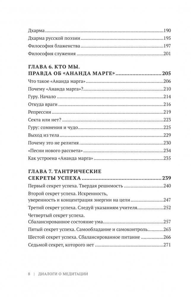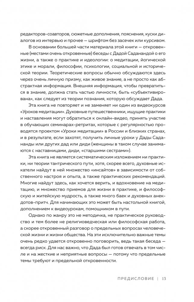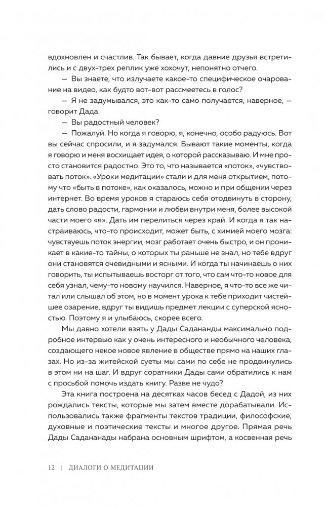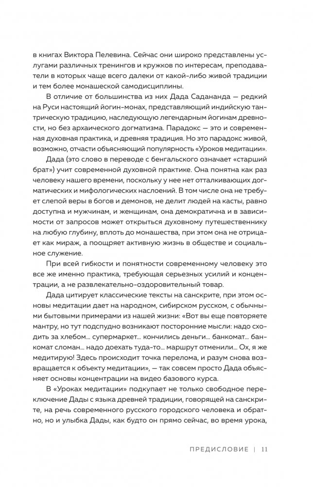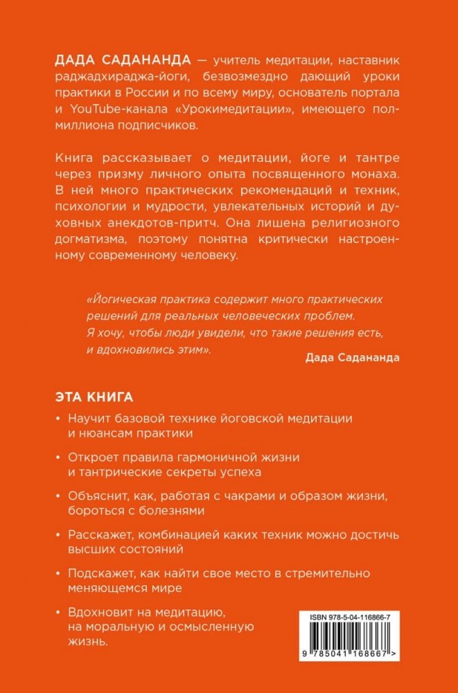 Книга рассказывает о медитации, йоге и тантре через призму личного опыта посвященного монаха. В ней много практических рекомендаций и техник, психологии и мудрости, увлекательных историй и духовных анекдотов-притч. Она лишена религиозного догматизма, поэтому понятна критически настроенному современному человеку.