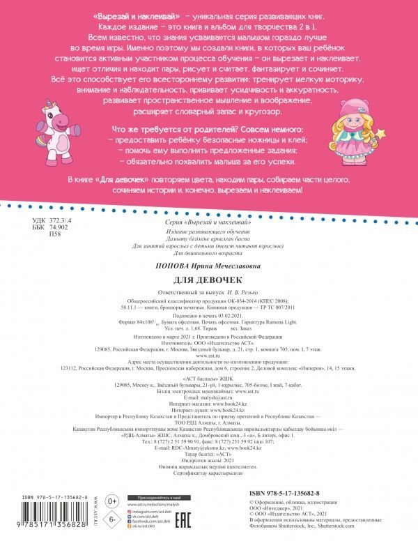 "Вырезай и наклеивай" — уникальная серия развивающих книг. Каждое издание — это книга и альбом для творчества 2 в 1. Всем известно, что знания усваиваются малышом гораздо лучше во время игры. Именно поэтому мы создали книги, в которых ваш ребёнок становится активным участником процесса обучения — он вырезает и наклеивает, ищет отличия и находит пары, рисует и считает, фантазирует и сочиняет.