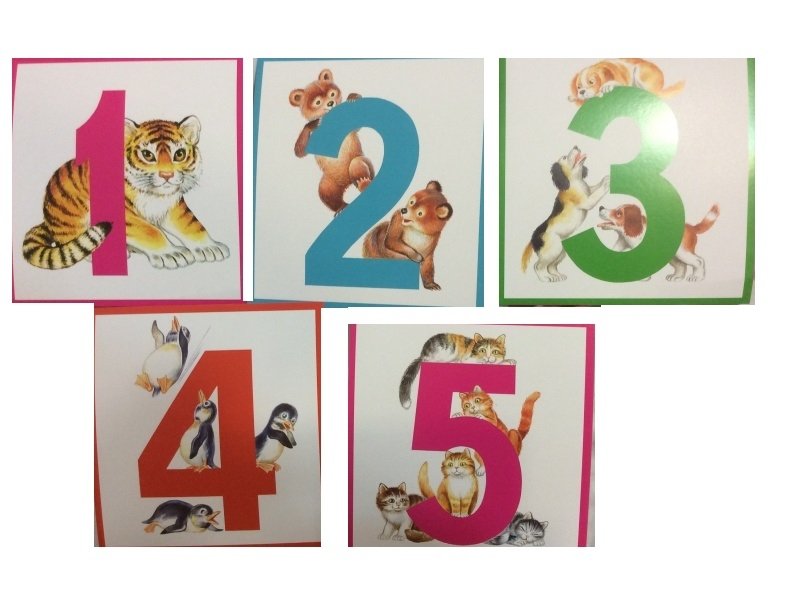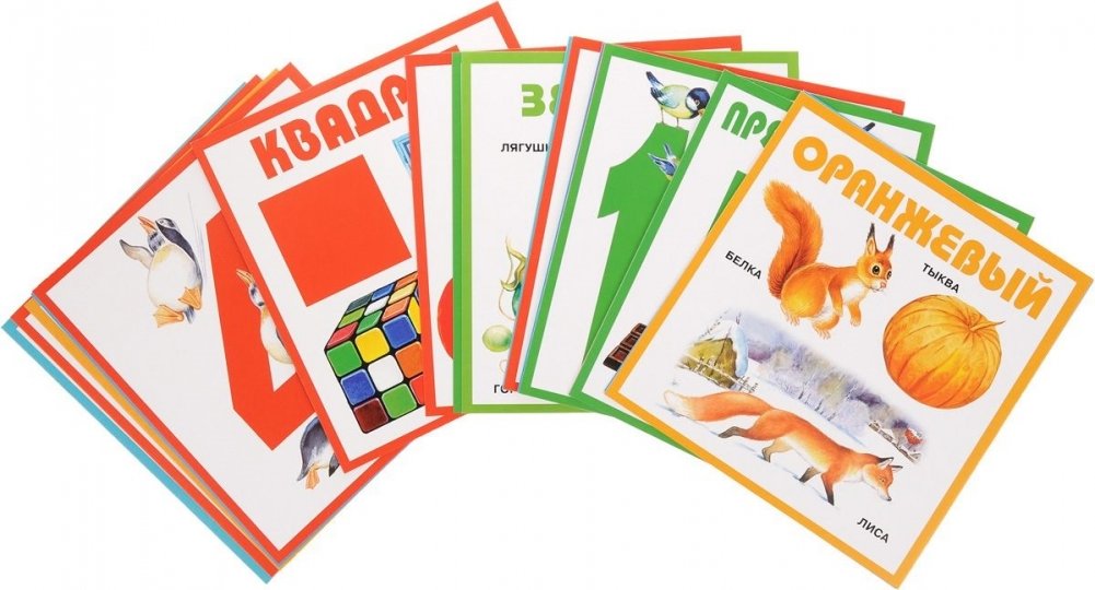 Набор карточек с цветными фотографиями животных, растений, продуктов и предметов с написанием их количественного обозначения разными цветами. В наборе 22 карточки.