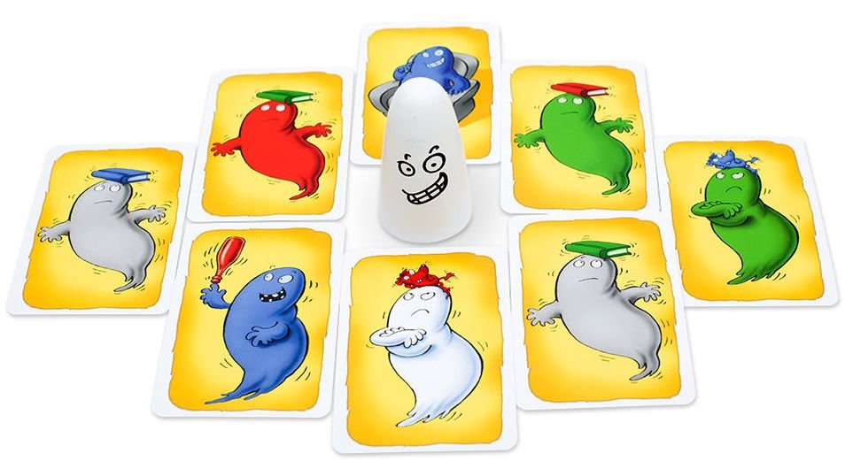 Состав игры: 60 карт, 5 предметов для хватания: зелёная бутылка, красное кресло, белое привидение, серая мышка, синяя книжка, правила игры на русском языке внутри, коробка.
