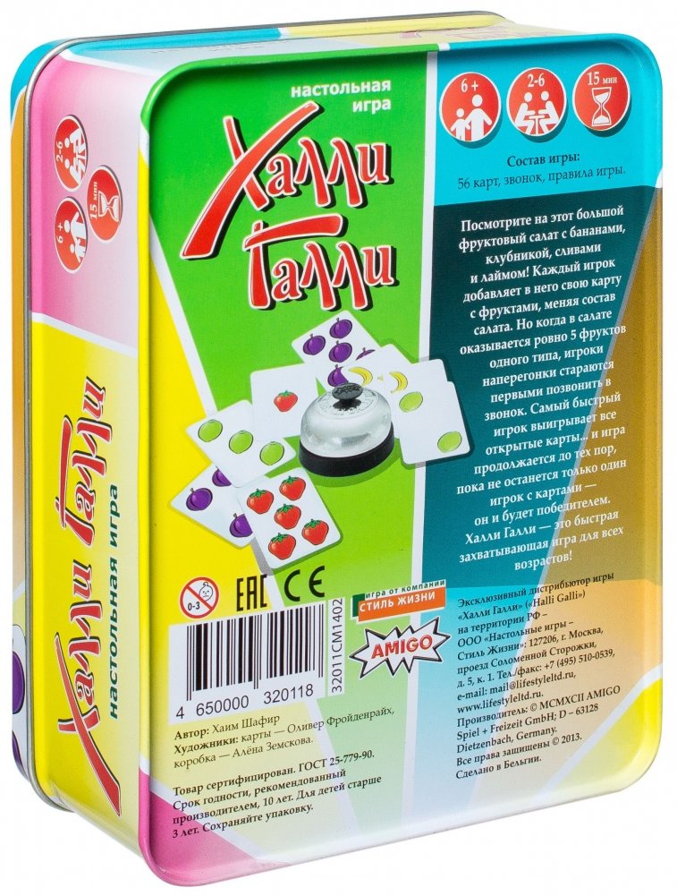 Что нужно, чтобы приготовить самый лучший фруктовый салат? Конечно же, настольная игра Халли Галли (Halli Galli)! Итак, у вас есть колода из 56 карт: на каждой карте изображен один вид фруктов (бананы, клубника, лаймы или сливы) в количестве от 1 до 5. Карты раздаются поровну между участниками, в центре стола ставится звонок. Игроки по очереди открывают карты, и как только на открытых картах всех игроков в сумме оказывается ровно 5 фруктов одного вида – надо звонить в звонок. Самый быстрый забирает все открытые карты себе, а побеждает тот, у кого в конце игры окажутся все карты! Игра отлично тренирует устный счет, внимательность, скорость реакции. Очень веселое и азартное соревнование для всех возрастов.
