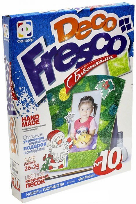 Теперь цветной кварцевый песок стал прекрасным материалом для декора. Стоило только смешать его в наборе "Декофреско" с блестками и мы получили новый оригинальный способ украшения! Предлагаем вам научиться ярко декорировать различные предметы интерьера, и украсить свой дом. Этот набор раскроет способности настоящего дизайнера; уникальные и красивые изделия, сделанные своими руками, выделят мастера и станут предметами его гордости, эта серия представляет два популярных вида интерьерных украшений - оригинальная фоторамка и необычные часы. Из комплекта дурных деталей можно легко и быстро брать новую деталь домашнего интерьера! Но самое интересное - это декорирование, когда можно наносить на основу при помощи клея и кисточки песок с волшебными блестками. Цветной фактурный материал покрытия, эффектно переливаясь, дает невообразимо яркий результат! Развивайте чувство вкуса и смело становитесь оригинальными творцами стиля вашего интерьера!