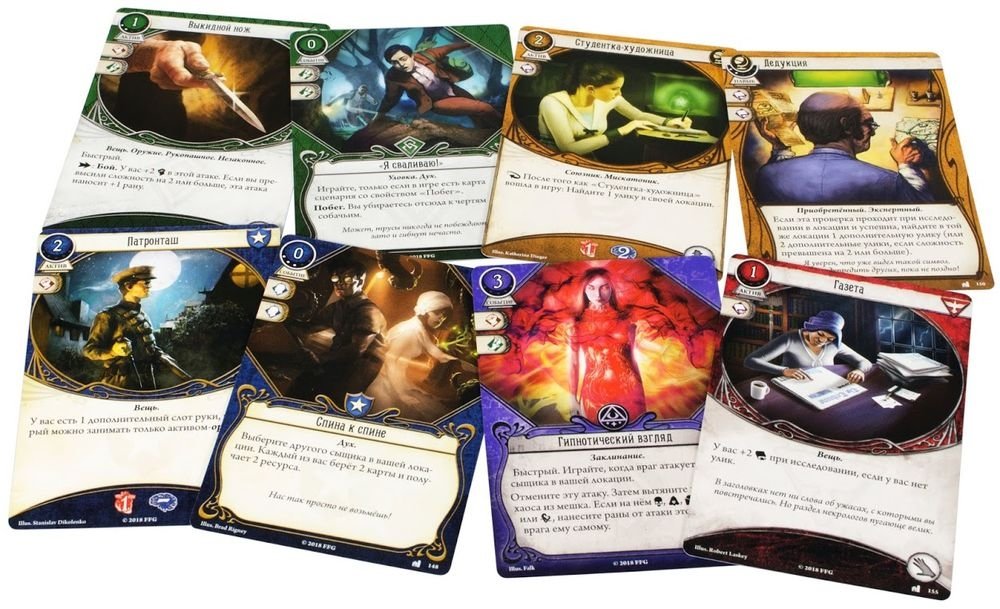 Для игры вам понадобятся базовый набор карточной игры "Ужас Аркхэма" и большое дополнение "Наследие Данвича".