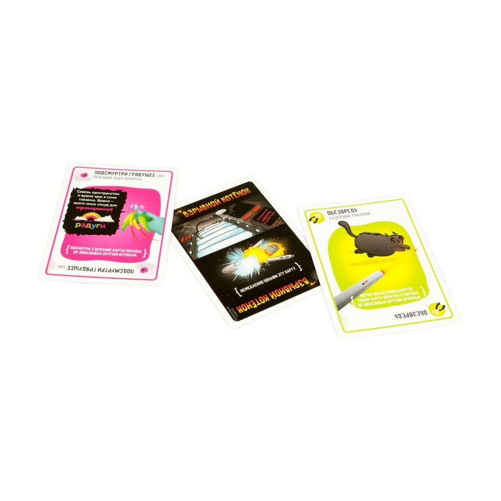 Для этого в игре есть карты обезвреживания — всего их 6 штук. Примени на кота с бомбой лазерную указку, отправь его на кошачью терапию или же накорми мятными бутерами и ты спасен, но не надолго. Обезвреженный кот не выбывает из игры, но ложится опять в колоду и перемешивается.