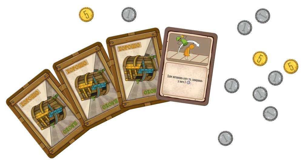 В наборе: игровое поле, 59 карт, 90 жетонов монет, 5 персонажей, 5 подставок под персонажей, 2 кубика, свод законов.