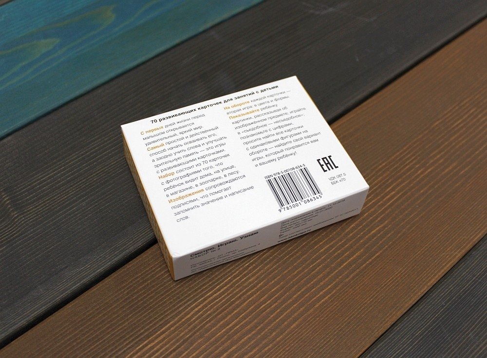 На обороте каждой карточки — вторая игра: в цвета и формы. Показывайте ребёнку картинки, рассказывая об изображённом предмете; играйте в «съедобное — несъедобное»; познакомьте с цифрами, просите найти все карточки с одинаковыми фигурами на обороте — найдите свой вариант игры, который понравится вам и вашему ребёнку!