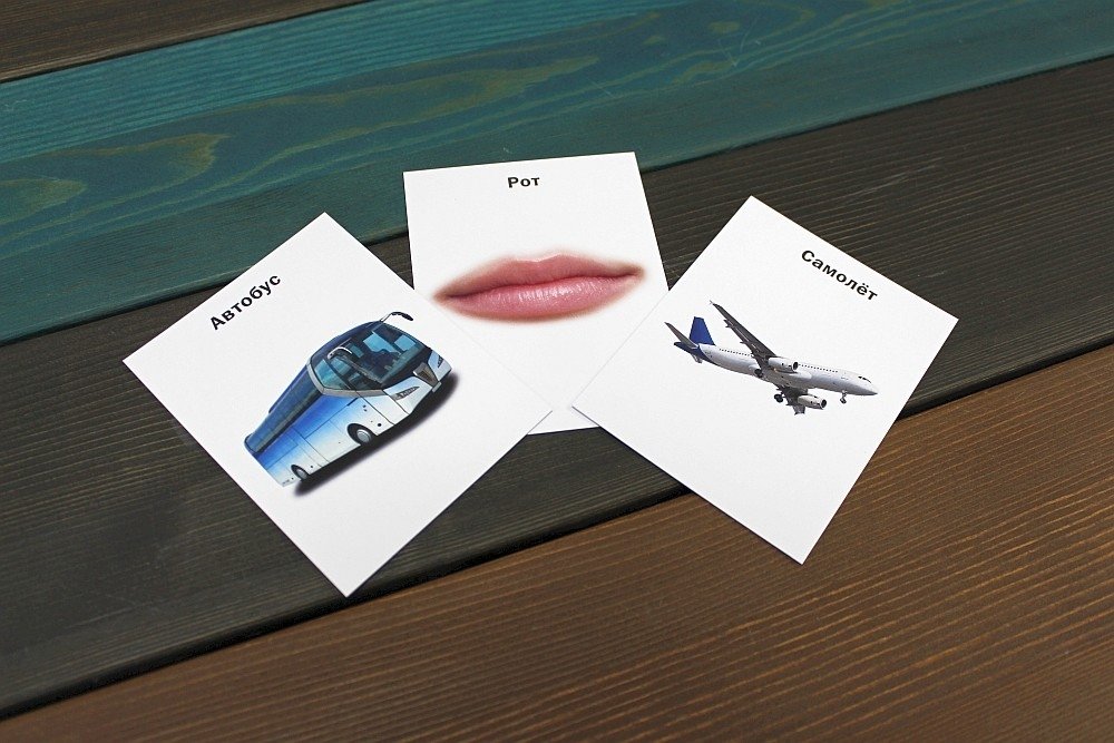 Набор состоит из 70 карточек с фотографиями того, что ребёнок видит дома, на улице, в магазине, в зоопарке, в лесу. Изображения сопровождаются подписями, что помогает запомнить значение и написание слов.