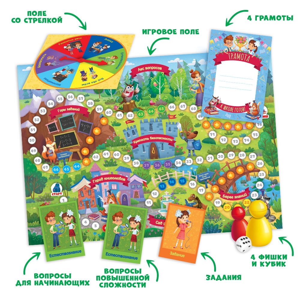 Увлекательная викторина для будущих школьников. Новые знания, загадки, а главное - 400 занимательных вопросов и заданий. Шесть самых важных тематик для дошколят: развитие речи, математика, естествознание, логика, безопасность и все обо всем. В наборе – игровое поле, 4 фишки и кубик, грамоты, второе поле со стрелкой, 78 карточек с вопросами и 36 карточек с заданиями.