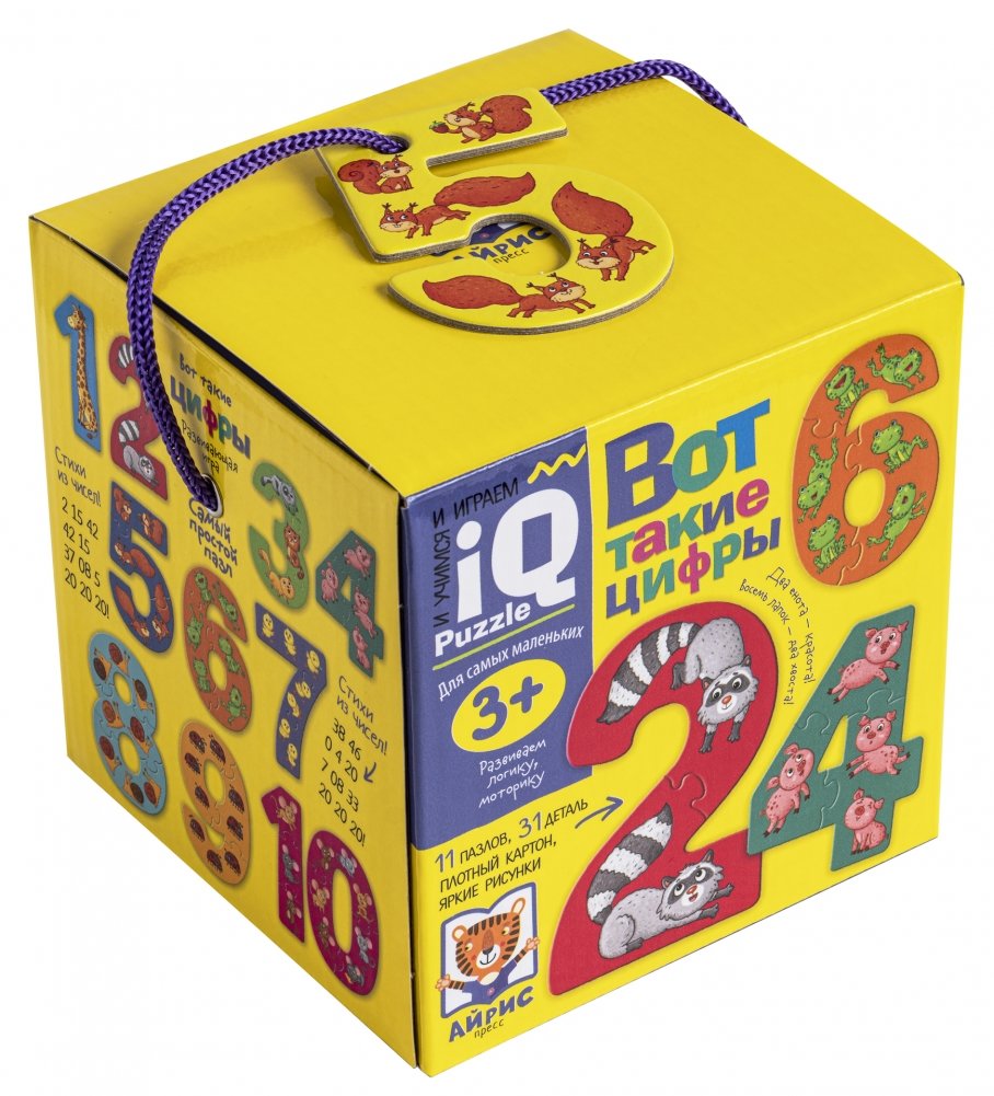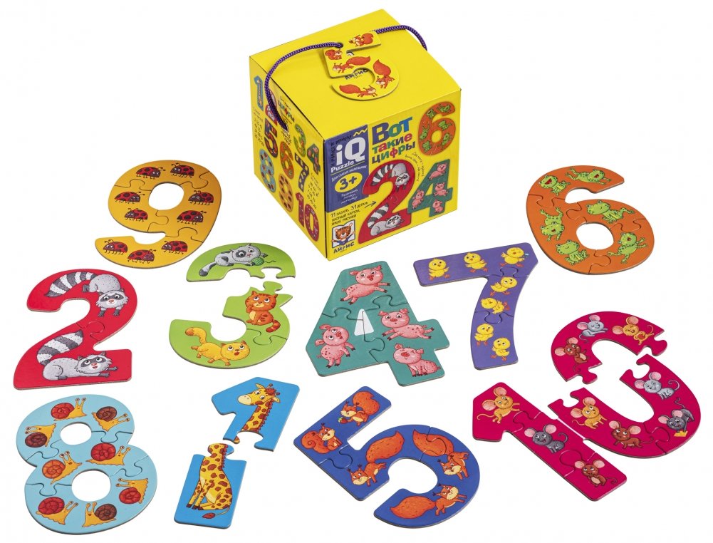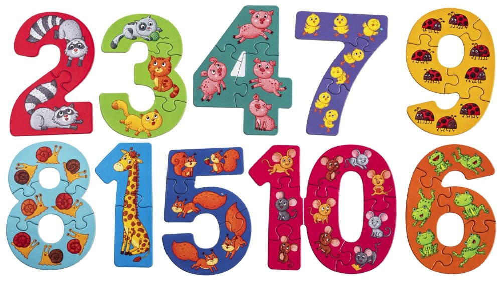 Набор состоит из 11 пазлов, которые познакомят ребёнка с цифрами и азами счёта. Пазлы состоят из двух-трёх частей и складываются в виде цифр от 0 до 9 и числа 10. На каждой цифре изображено соответствующее количество животных. Детали выполнены из плотного толстого картона. Благодаря этому они ровно лежат, замки легко соединяются и хорошо держатся. Набор предназначен для детей от 3 лет.