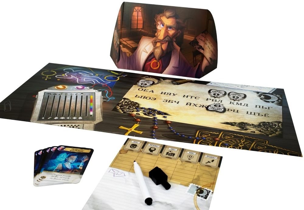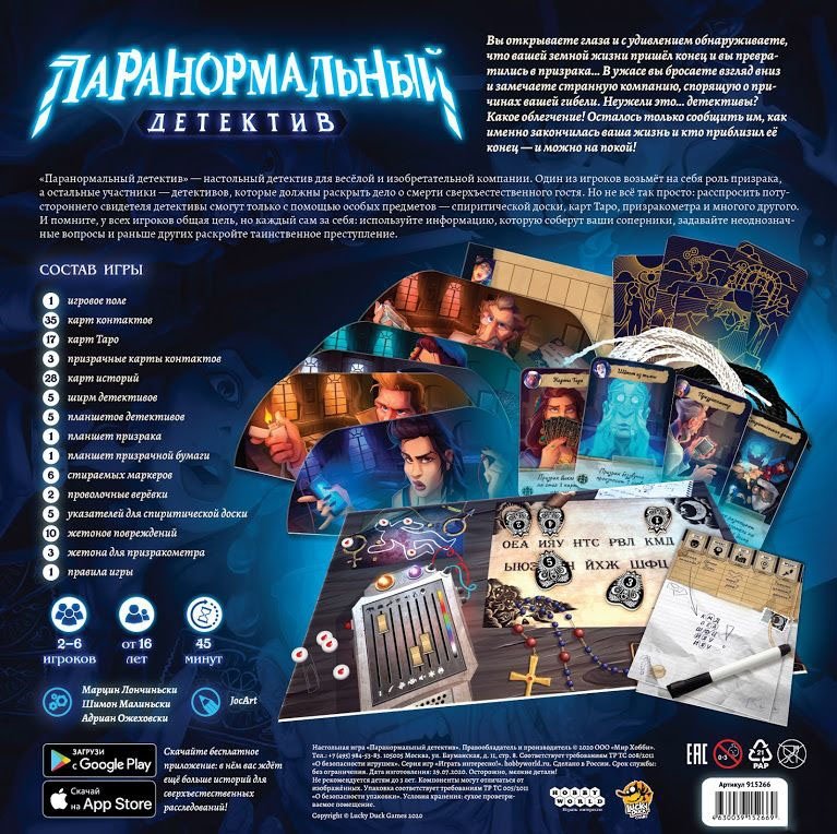 «Паранормальный детектив» — настольный детектив для весёлой и изобретательной компании. Один из игроков возьмёт на себя роль призрака, а остальные участники — детективов, которые должны раскрыть дело о смерти сверхъестественного гостя. Но не всё так просто: расспросить потустороннего свидетеля детективы смогут только с помощью особых предметов — спиритической доски, карт Таро, призракометра и многого другого. И помните, у всех игроков общая цель, но каждый сам за себя: используйте информацию, которую соберут ваши соперники, задавайте неоднозначные вопросы и раньше других раскройте таинственное преступление.