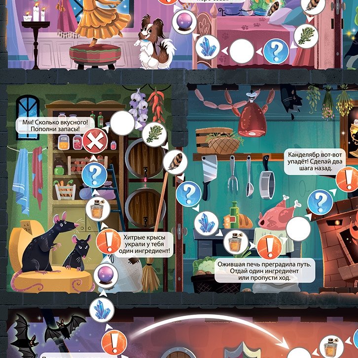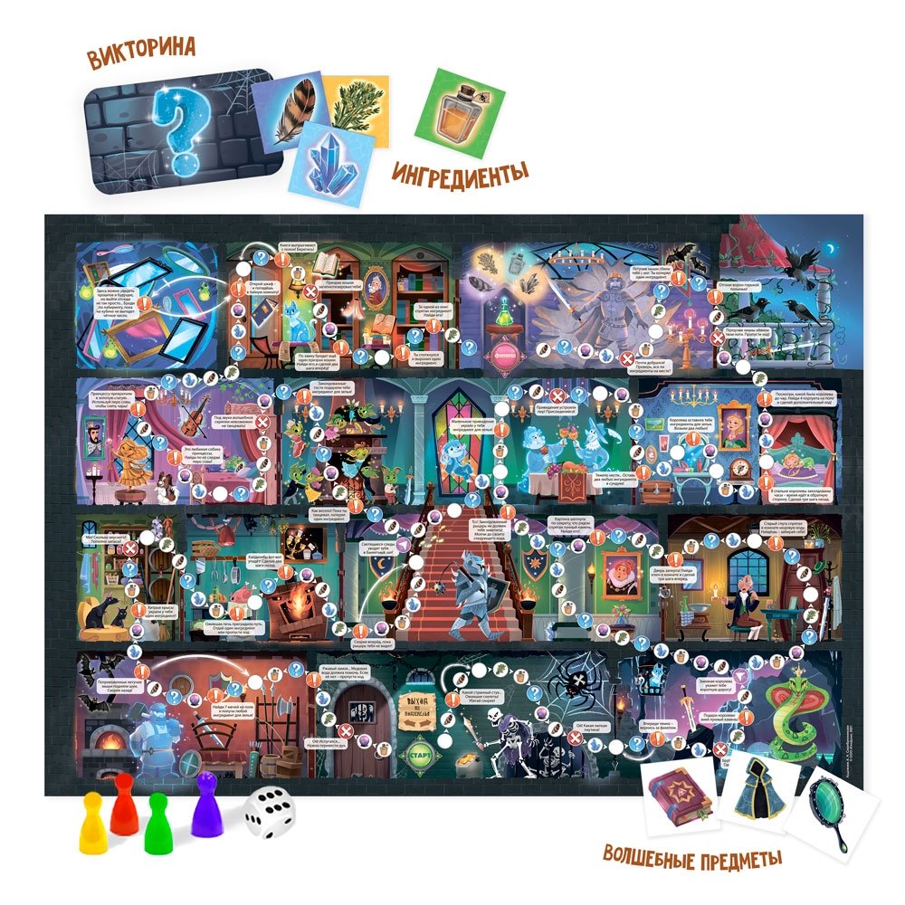 Игра-ходилка с викториной «Заколдованный замок» - это увлекательное приключение в мир волшебства! Здесь героев ждут подземелья, призраки и заколдованные обитатели замка! Нужно не просто дойти первым, а собрать все ингредиенты волшебного зелья и расколдовать короля, а вместе с ним и всех его придворных. В комплект игры входят карточки с вопросами викторины, карточки с магическими предметами и ингредиентами для приготовления зелья, а также кубик с фишками для игры. Отправляйтесь в сказочный путь прямо сейчас - и вас ждут увлекательные приключения!